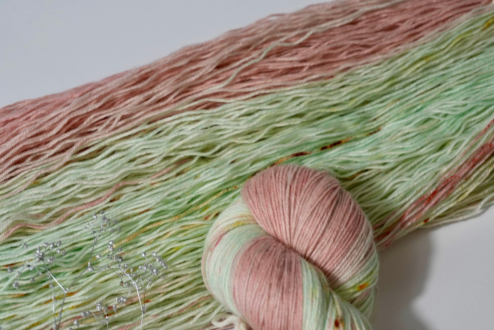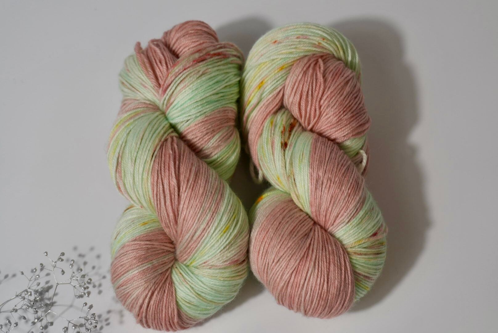 ソックブランクで染めているため、編み始めと編み終わりで色が変わります♪